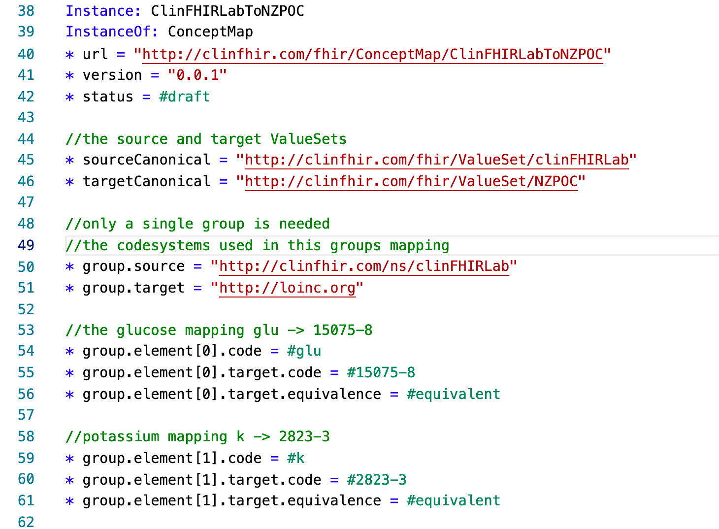 This isn’t quite as tidy as the other resources (FSH doesn’t yet have specific handling for ConceptMap) but it should be pretty straightforward to follow. There’s a single group with a source (line 50) and a target (line 51) code system.